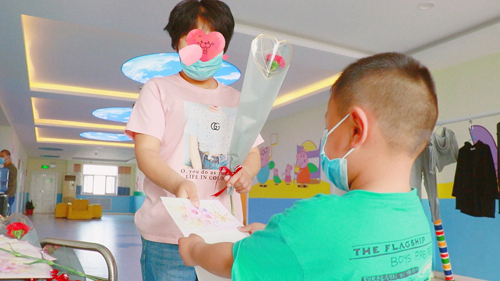 在等待候诊的同时,收到了我们的祝福,护士小姐姐将提前准备好的贺卡交给宝宝,让宝宝进一步尝试沟通,和妈妈表达祝福,平常不怎么说话的小天(化名)和妈妈说道“抱抱~”,就是这简单的两个字,王妈妈激动的抱起小天(化名),激动的留下了感动的泪水~