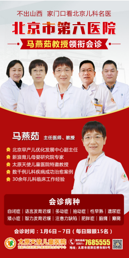 为了让山西及周边的孩子们接受到更专业的诊疗,1月6-7日,太原天使儿童医院特邀北京市第六医院马燕茹教授与我院专家共同为多动症、抽动症、自闭症、语言障碍、智力低下等特殊疾病患儿进行联合会诊,给孩子带来更专业的诊疗和康复的希望!同时,为了保证会诊质量,每日仅限15个预约名额,患儿家长一定要提前预约哦!