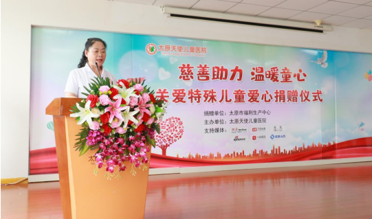 上午10点,“慈善助力·温暖童心”关爱特殊儿童爱心捐赠仪式如期举行,太原市福利生产中心林主任、太原天使儿童医院贾院长出席了仪式,太原天使儿童医院全体医护人员和部分患儿家长到场参加。