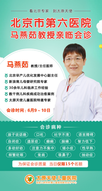 为了帮助这些特殊疾病儿童不出远门、在家门口就能享受到北京名医治疗,6月9-10日,太原天使儿童医院将特邀北京市第六医院马燕茹教授来院会诊,为患儿排忧解难,让每一位来院患者都能享受到个人专属治疗方案。